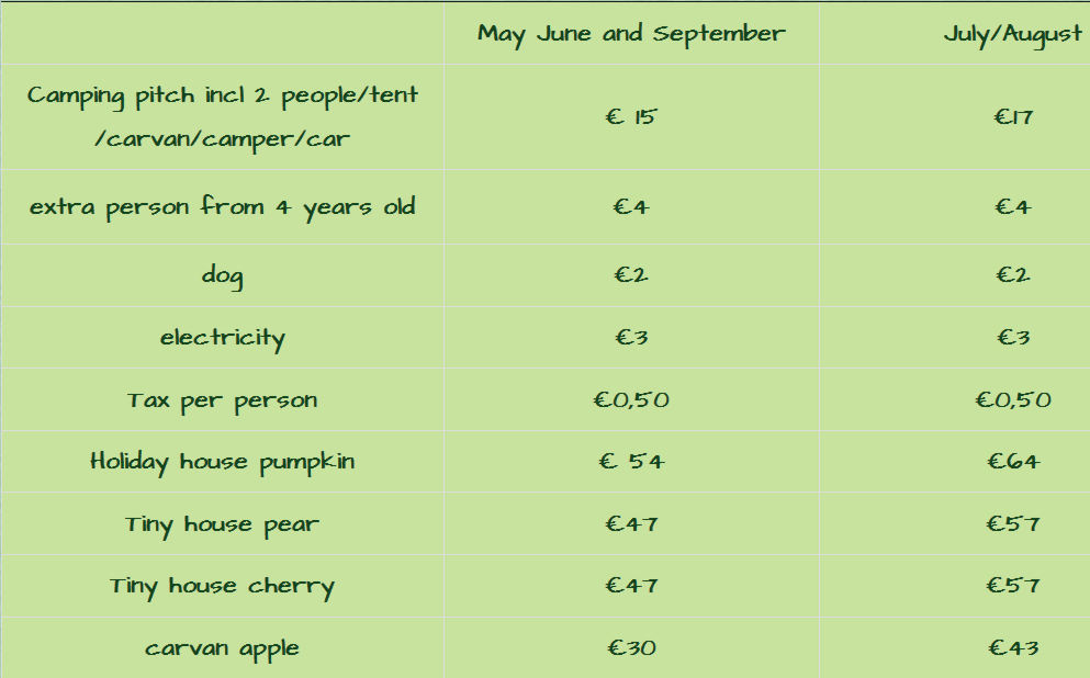 Tent: 19.50€/day 17.50€/day Animal: 3.00€/day 2.00€/day